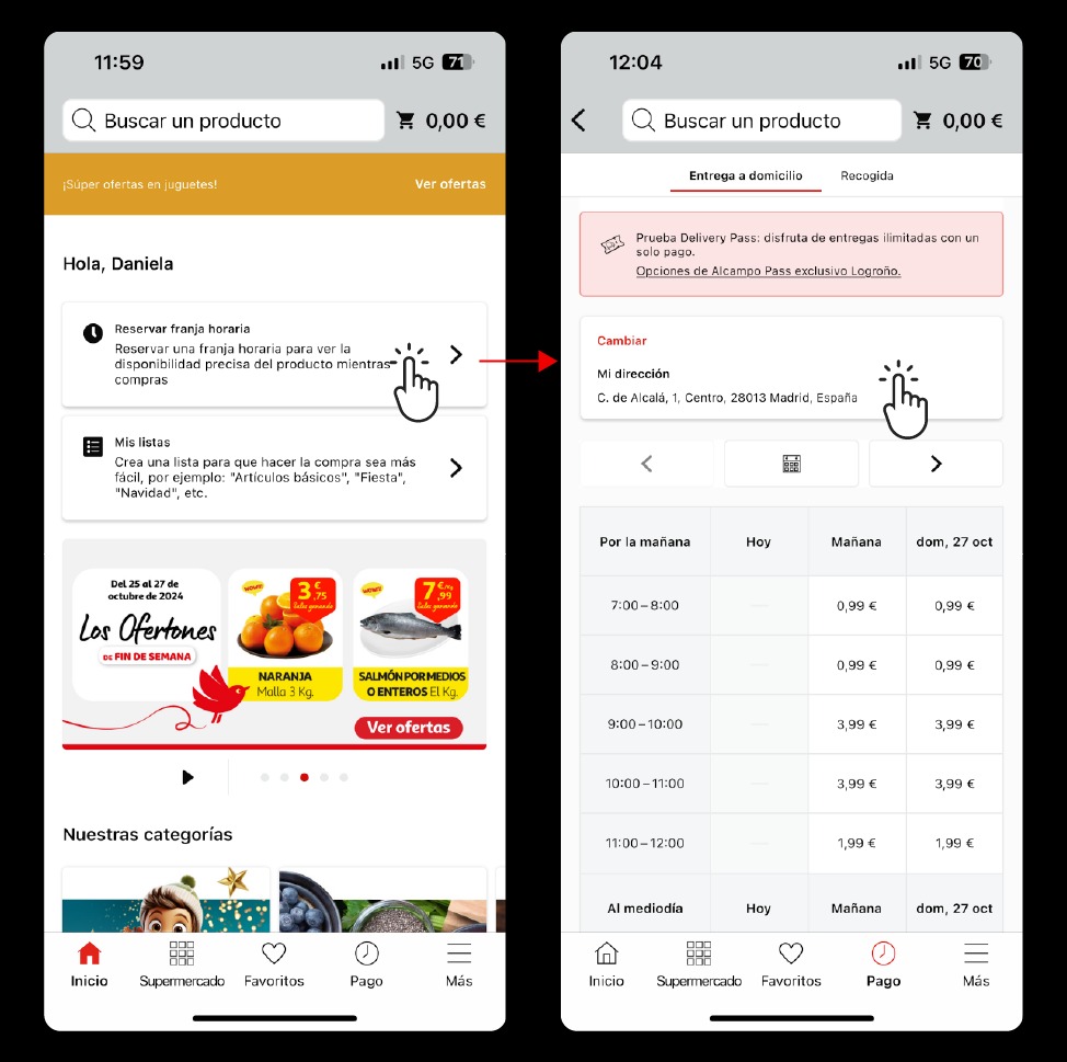 - Indica tu dirección de entrega o selecciona la tienda donde prefieres recoger el pedido. Esto es clave para que puedas ver los productos disponibles en tu zona y los tiempos de entrega.